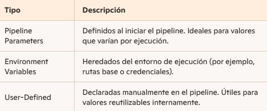 Las variables actúan como contenedores de valores que pueden cambiarse sin modificar la estructura del pipeline. Sirven para parametrizar rutas de archivos, credenciales, fechas, entidades, escenarios y más. Al usar variables, un solo flujo puede atender múltiples entornos o ciclos de procesamiento.